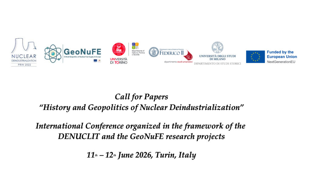 Convegno internazionale “History and Geopolitics of Nuclear Deindustrialization“, organizzato dai progetti Denuclit (Prin 2022) e GeoNuFE (ERC 2025), che si terrà a Torino nei giorni 11-12 giugno 2026. La scadenza per l’invio delle proposte è il 28 febbraio 2026.